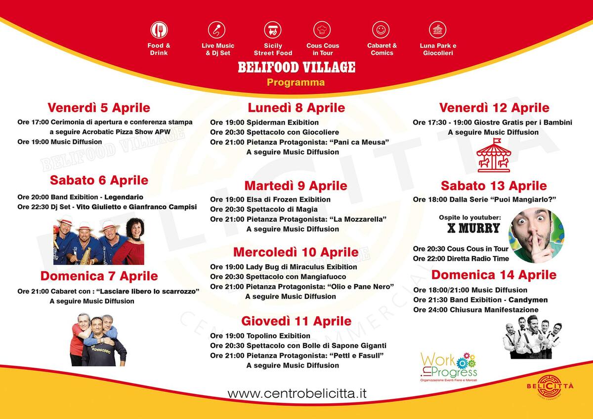 Ugo Gaeta che coadiuvato da tutto il suo team con l’organizzazione “Work in Progress” e con Gianfranco Campisi in pochissimo tempo hanno realizzato un grande evento per deliziare e far divertire le persone che visiteranno il centro Belicittà, garantendo loro una grande festa del cibo tradizionale siciliano, tanta musica e tantissimi sorrisi. Saranno allestiti degli stand per degustare le tipiche specialità siciliane e non solo: dal Cous Cous in Tour alla mozzarella Napoletana, dal Pane ca Meusa a tante altre specilità tipiche, il tutto con spettacoli per bambini, giostre, giocolieri e personaggi Disney, si esibiranno i Legendario e i Candyman, ospite della kermesse direttamente dalla serie “Puoi Mangiarlo?” lo youtuber X MURRY.