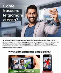 Posiziona lo smartphone in orizzontale, registra un video messaggio di massimo 30'' o foto, ed invialo dalla nostra pagina Facebook tramite “Messenger”. Faremo una selezione e pubblicheremo un video con i vostri filmati e foto su primapaginacampobello.it #cometrascorrolegiornateacasa