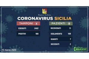 In totale sono 188 i casi positivi registrati dall'inizio, di cui 71 ricoverati (15 in terapia intensiva), 108 in isolamento domiciliare, sette guariti e due deceduti. Questa la divisione nelle varie province: Agrigento, 20; Caltanissetta, 2; Catania, 91; Enna, 2; Messina, 10; Palermo, 33; Ragusa, 4; Siracusa, 15; Trapani, 11.