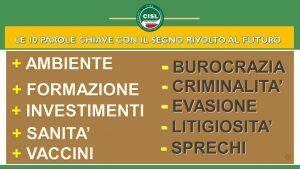 Serve dunque un Patto per lo sviluppo fra istituzioni, categorie professionali, parti sociali e forze sociali, che serva a porre in cima all’agenda degli interventi le politiche per il lavoro, le infrastrutture, la formazione, la ricerca e innovazione, la sanità e l’inclusione sociale, avviando un confronto puntuale e sistematico nel corso del quale ognuno faccia la propria parte assumendosene la responsabilità”.