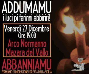 Sull'onda della grande partecipazione all'assemblea cittadina per la presentazione della Campagna Regionale "Si Resti Arrinesci", il 27 dicembre alle ore 19:00 sotto l'Arco Normanno a Mazara del Vallo e in molte altre piazze siciliane si terrà una manifestazione simbolica dal titolo "Addumamu i luci pi farinni abbiriri", allo scopo di tenere alta l'attenzione sul tema dell'emigrazione forzata dalla Sicilia. Tutta la cittadinanza sensibile alla grande questione dello spopolamento del territorio siciliano è invitata ad intervenire, portando con se una fonte di luce per rappresentare i tanti ragazzi e lavoratori che ogni anno abbandonano la terra mazarese.