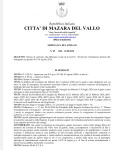 Con ordinanza n. 85 di oggi il Sindaco Salvatore Quinci, quale misura di contrasto alla diffusione del Covid, ha disposto per i giorni 14, 15 e 16 agosto nelle spiagge libere del territorio, i DIVIETI - dell'utilizzo di gazebo, tende, bivacchi, accampamenti; - di accensione di falò e fuochi di ogni genere anche contenuti; - di produrre suoni a mezzo di altoparlanti o di amplificatori; - di consumare e detenere anche su area pubblica cibo, bevande alcoliche e superalcoliche contenute in bottiglie/recipienti in vetro e plastica.