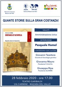 “Costanza d’Altavilla – Biografia eretica di un’imperatrice”: è il titolo del libro di Pasquale Hamel, storico, scrittore e saggista, già direttore della Fondazione Federico II e per anni al vertice della struttura della Regione Siciliana. Il volume sarà presentato sabato 28 febbraio alle ore 17 al teatro Garibaldi di Mazara del Vallo nell’ambito della conferenza “Quante Storie sulla Gran Costanza” organizzata dalle associazioni Fidapa Bpw Italia e Alchimie di Mazara del Vallo, con il patrocinio della civica amministrazione.