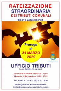 Il termine di presentazione delle istanze di rateazione dei tributi comunali è prorogato dal 31 gennaio al 31 marzo 2020. Lo ha deciso la Giunta Municipale di Mazara del Vallo presieduta dal Sindaco Salvatore Quinci. Più tempo, quindi, per imprese e cittadini di mettersi in regola con i tributi comunali. “La possibilità di proroga – dice l’assessore alle Finanze Caterina Agate – era già prevista dal regolamento vigente ed abbiamo deciso di attuarla. Sono già numerosi i cittadini che hanno aderito alla rateazione mediante istanze presentate, che allo stato sono in lavorazione e prevediamo che saranno ancora più numerosi, grazie alla proroga al 31 marzo.