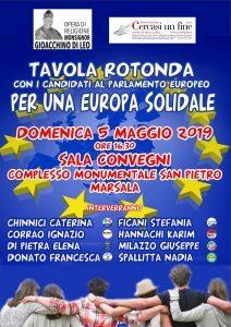 Domenica 5 maggio 2019, dalle ore 16.30 alle ore 19.30, presso la Sala Convegni del Complesso Monumentale di San Pietro di Marsala, a conclusione del 2° anno della Scuola di formazione all’impegno sociale e politico organizzata dall'Opera di Religione Mons. Gioacchino e dall'Associazione Cercasi un fine Onlus, avrà luogo l’iniziativa di informazione socio-politica “Per una Europa solidale. Tavola Rotonda con i Candidati al Parlamento Europeo”. Parteciperanno i seguenti Candidati: Chinnici Caterina (Partito Democratico – Siamo Europei) – Corrao Ignazio (Movimento 5 Stelle) – Di Pietra Elena (Popolo della Famiglia – Alternativa Popolare) – Donato Francesca (Lega Salvini Premier) – Ficani Stefania (Più Europa Italia in Comune) Hannachi Karim (La Sinistra) – Lombardo Alberto (Partito Comunista) - Milazzo Giuseppe (Forza Italia) – Spallitta Nadia (Europa Verde European Green Party).