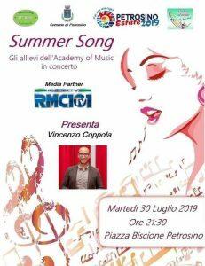 Sul palco si esibiranno gli allievi della scuola di canto “Academy of Music”. Annullato per motivi tecnici e organizzativi il “Festival du Gnocculo” Sarà ancora la musica protagonista stasera (30 luglio) in piazza Biscione nell’ambito di “Petrosino Estate 2019”. A partire dalle ore 21 si svolgerà il “Summer Song”, iniziativa a cura dell’associazione culturale “Art News”. Sul palco si esibiranno gli allievi dell’Academy of Music di Marsala, scuola di canto nata nel 2015 da un’idea di Gaspare Sammartano.