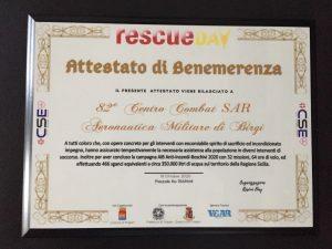 Nella mattinata di oggi, 27 Ottobre 2020, è stato consegnato un Attestato di Benemerenza all’82° Centro Combat S.A.R. (Search And Rescue) di Trapani per il RESCUE DAY, manifestazione che si tiene ogni anno a Trapani, alla quale partecipano assetti militari e civili impegnati nel soccorso alla popolazione. Purtroppo quest’anno l’evento si è svolto in forma ridotta causa le disposizioni atte a contrastare l’epidemia di COVID 19, ma l’organizzatore Antonino ALESTRA ha voluto ugualmente consegnare al Comandante del Centro, Maggiore Angelo MOSCA, una targa di Benemerenza per le operazioni di soccorso e per l’impegno nella lotta agli incendi boschivi che caratterizzano l’operato dell’82° Centro C.S.A.R.