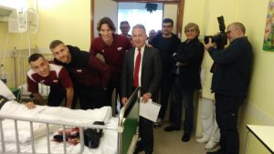 Festa stamattina tra gli otto bambini ricoverati al Sant’Antonio Abate nel reparto di Pediatria per la visita dei giocatori del Trapani calcio. Gli atleti si sono intrattenuti con i piccoli pazienti distribuendo doni e gadget della squadra granata regalando un momento di autentica emozione ed entusiasmo soprattutto fra i più grandi. Il reparto di Pediatria guidato da Marcello Palmeri, infatti, al momento ospita ricoverati dai due mesi di vita sino a 16 anni. L’iniziativa nasce dalla collaborazione fra la direzione strategica dell’Azienda sanitaria provinciale di Trapani e la dirigenza sportiva della squadra di calcio, con la precisa finalità di regalare un momento di puro entusiasmo ai bambini che in prossimità del Natale sono ricoverati nel reparto di pediatria dell’ospedale.