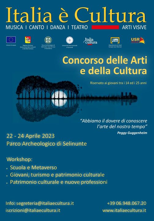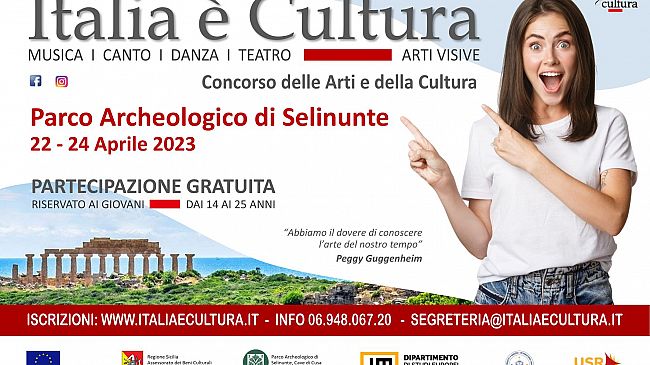 Dopo il grande successo della scorsa edizione di "Italia è Cultura", il concorso nazionale delle arti e della cultura, a cui erano state presentate 953 richieste di iscrizione, è tutto pronto per l'edizione 2023 della manifestazione. Le selezioni per la Sicilia si svolgeranno dal 22 al 24 Aprile presso il Parco Archeologico di Selinunte. La partecipazione al Concorso è aperta a tutti i residenti in Italia di età compresa tra i 14 ed i 26 anni non compiuti alla data di inizio delle selezioni. Si può partecipare sia individualmente che in gruppo. La partecipazione al Concorso è gratuita. Anche quest'anno saranno cinque le categorie in gara: Musica, Canto, Teatro, Danza, Arti visive.